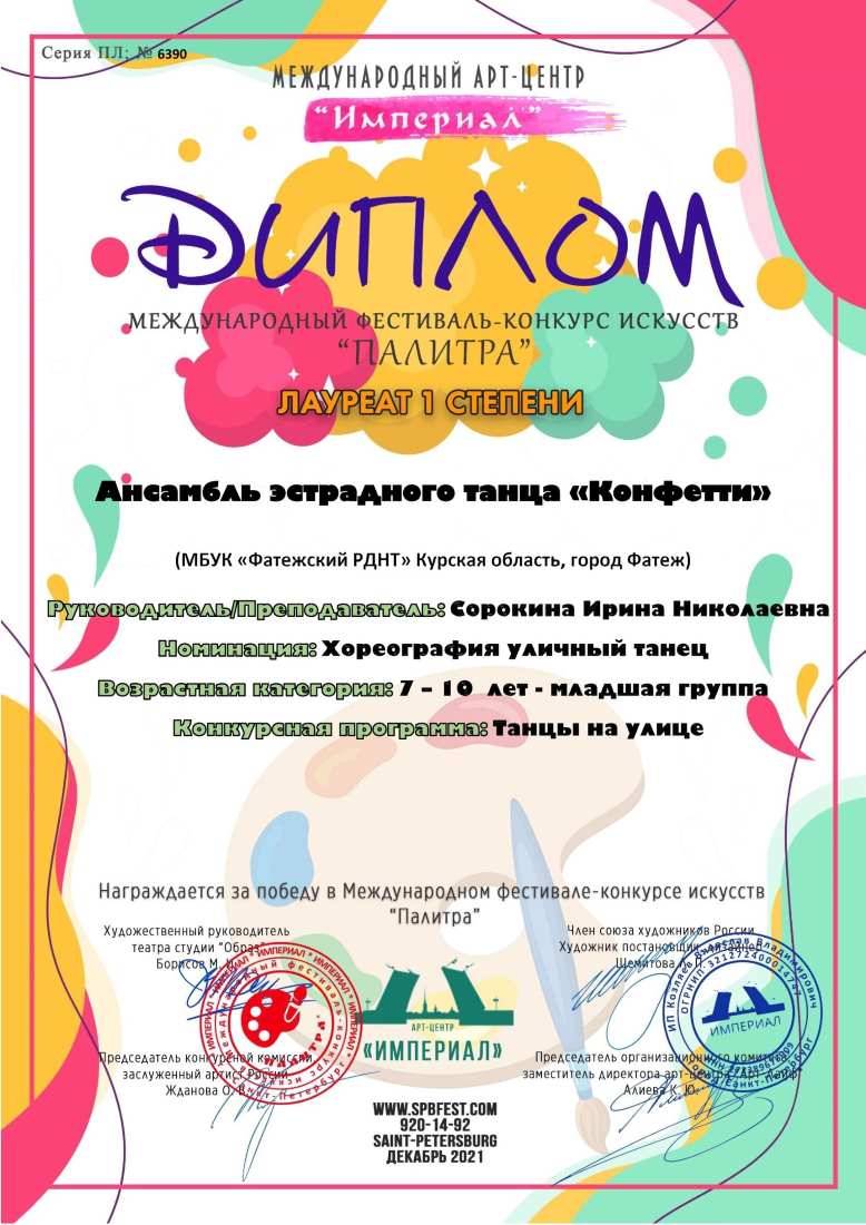 За участие в Международном конкурсе-фестивале искусств "Палитра" - Лауреат I степени;